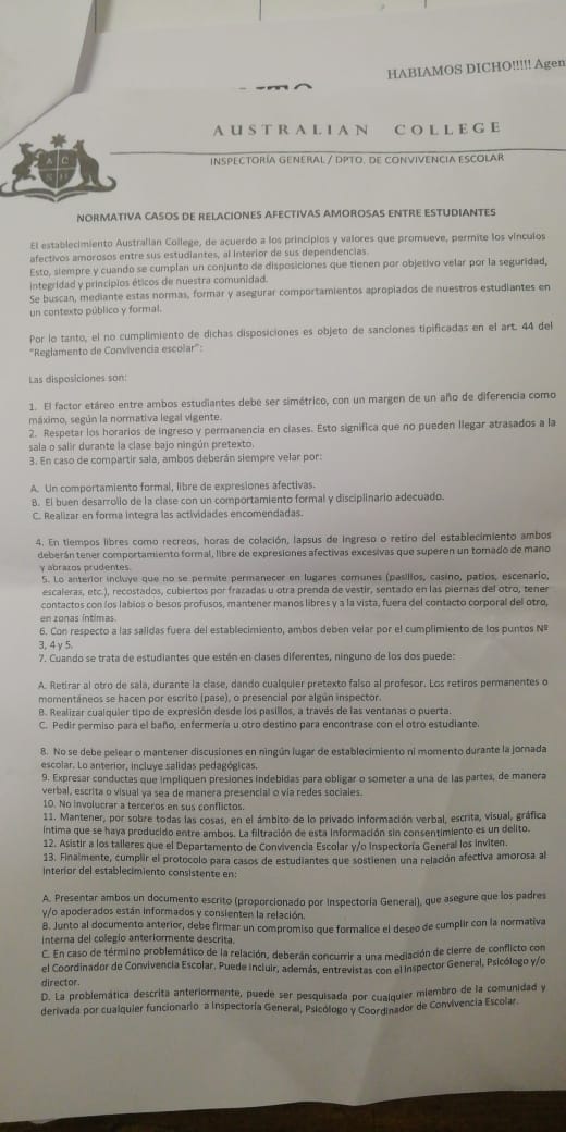 Eso dice el mensaje que recibieron los apoderados del Colegio Australian College, de Quilicura. Una circular que debían firmar para aclarar si ellos, como adultos, estaban al tanto de la relación amorosa de sus hijos.
