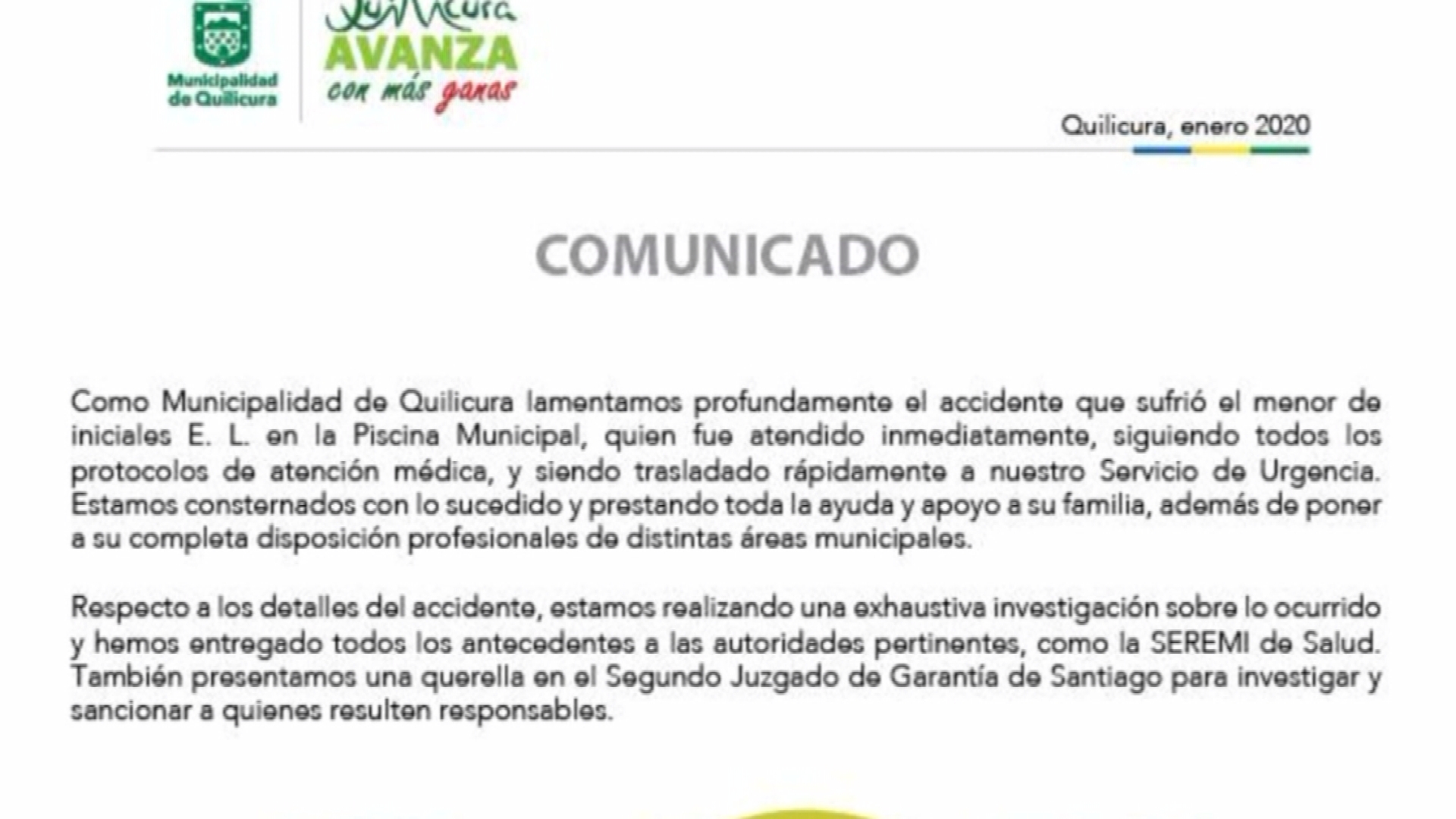"Como municipalidad de Quilicura lamentamos profundamente el accidente que sufrió el menor de iniciales E.L. en la Piscina Municipal, quien fue atendido inmediatamente, siguiendo todos los protocolos de atención médica", subrayaron junto con informar que están realizando una investigación sobre lo ocurrido.