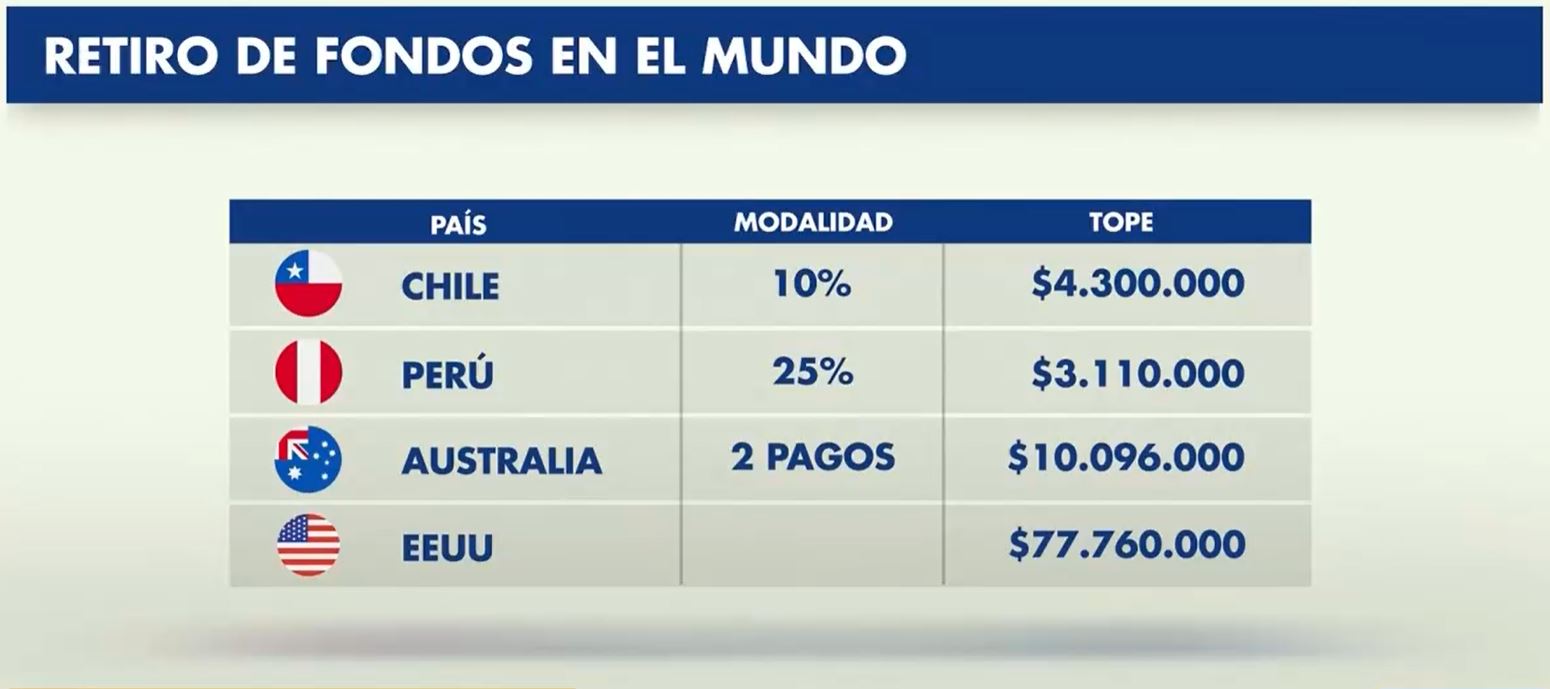 Lee también: ¿Realmente es el 10%? Los montos efectivos que afiliados podrían retirar de las AFPPor ejemplo, mientras en nuestro país se plantea un retiro del 10% de los ahorros para las pensiones, con un máximo $4.300.000, Perú permite el sustraer un 25%, pero con un máximo de $3.110.000.