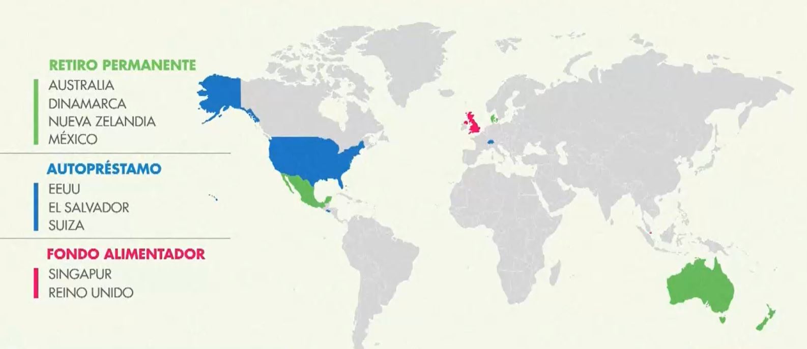 Finalmente, Singapur y Reino Unido mantienen un fondo alimentador, donde las cotizaciones individuales son parte del sistema de ahorro y se permiten los retiros.