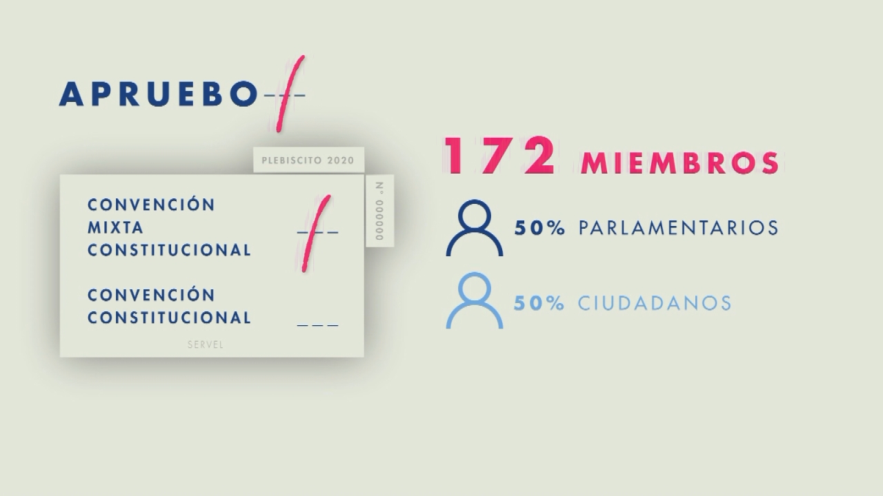 Pero si gana la opción Apruebo, se abre otro camino y toma importancia la segunda papeleta para saber cuál órgano redactaría la nueva Carta Magna. Una Convención Mixta Constitucional estará integrada por 172 miembros repartidos de forma equitativa en un 50% por parlamentarios y en un 50% por ciudadanos electos especialmente para estos efectos.