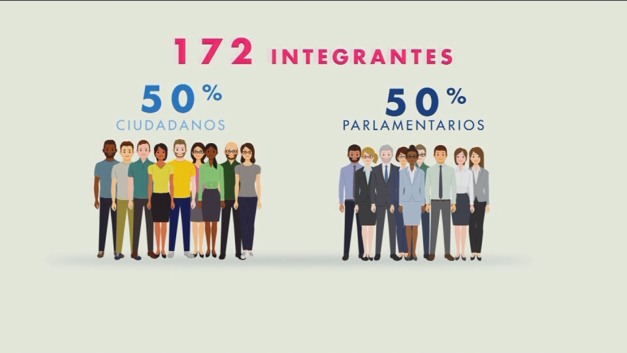 Una Convención Mixta Constitucional estará integrada por 172 miembros repartidos de forma equitativa en un 50% por parlamentarios y en un 50% por ciudadanos electos especialmente para estos efectos.