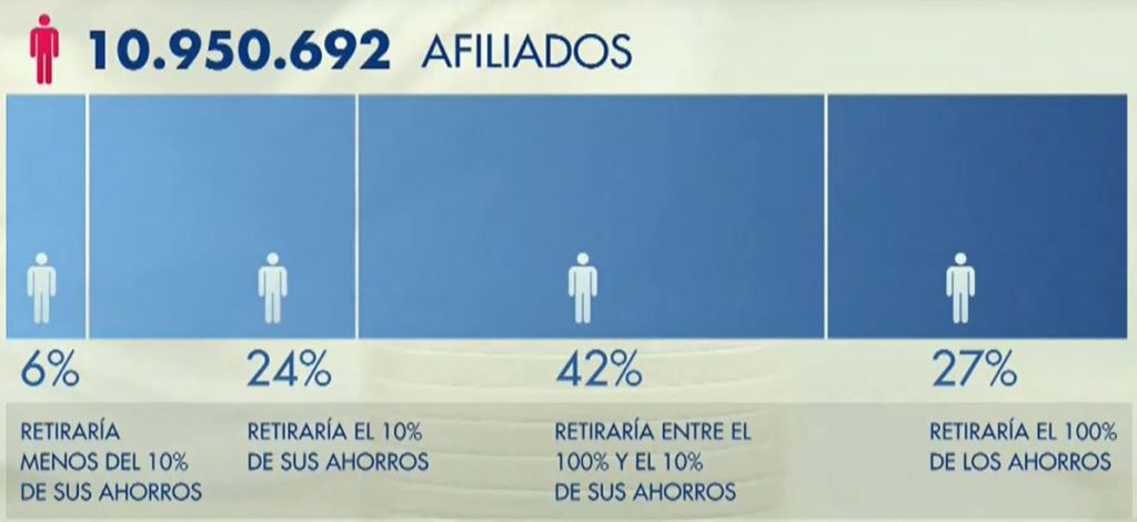 En tanto que solo el 24% de los afiliados podría hacer efectivo el retiro del 10% de sus fondos. Para graficarlo, quien tenga $30 millones en la AFP, podrá sacar $3 millones.