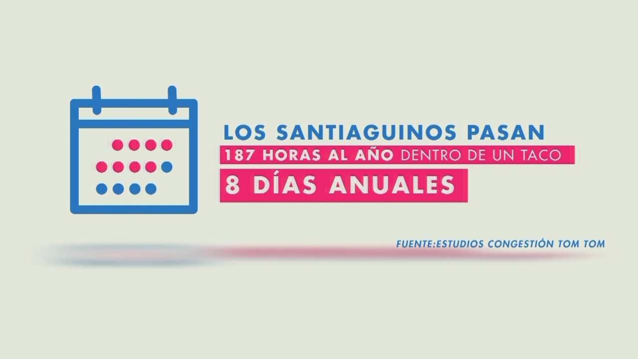 Lee también: Niño debe hacer las tareas dentro de camioneta por carretes de "lunes a lunes" en centro de eventos en Villa AlemanaSegún un estudio holandés, los santiaguinos pasan en promedio 187 horas al año dentro de un taco. Es decir, ocho días anuales se pierden en movilización.