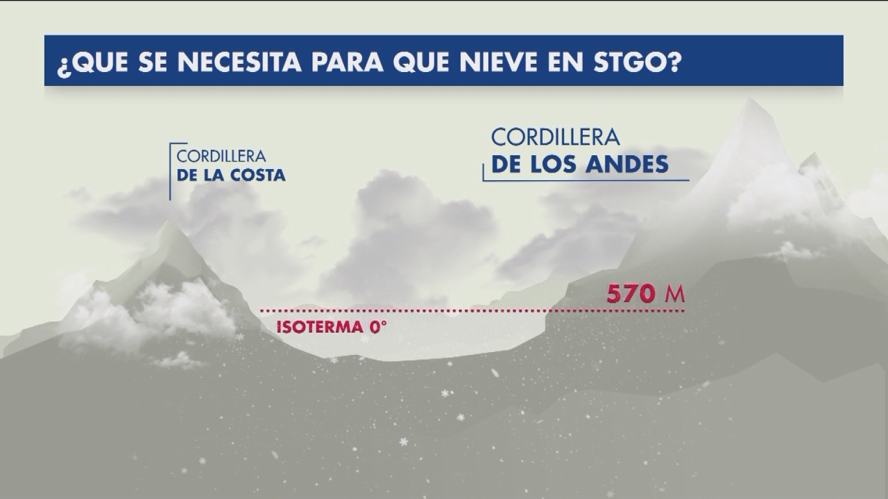 ¿Y qué pasa en Santiago? Para que en esa comuna pueda caer nieve, la temperatura debería ser de 0° y el límite de la caída de nieve, la famosa isoterma 0°, cerca de los 570 metros. Condiciones que no se cumplen este fin de semana.