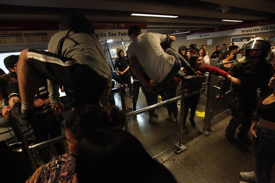 Jóvenes saltando los torniquetes del Metro. Manifestaciones en las estaciones por el reclamo estudiantil ante el alza de $30 del pasaje. Todo esto ocurría en los días previos al 18 de octubre de 2019.