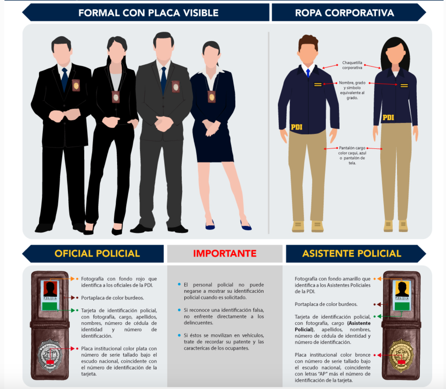 En la misma plataforma aclaran que los funcionarios de la PDI pueden identificarse con una vestimenta formal pero su placa visible, o mediante ropa corporativa reconocida por su chaqueta azul y pantalones color caqui. Elementos no utilizados por los policías en procedimientos encubiertos.