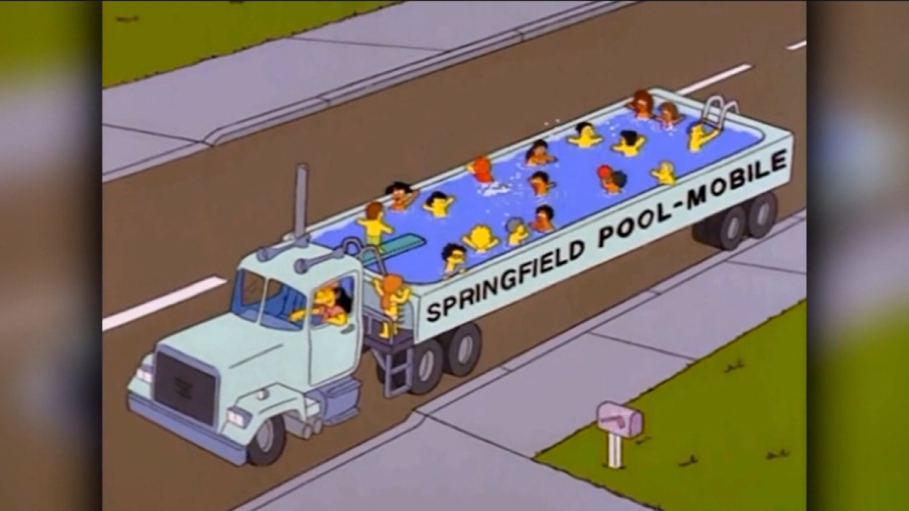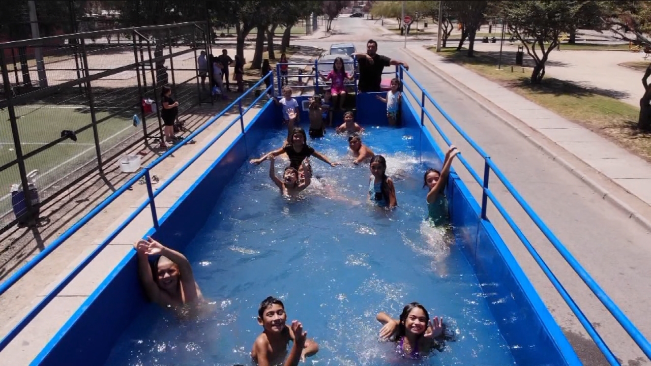 Y de esa idea inocente, pasó a una realidad, pero no en Springfield, sino en Paine. No dudó en transformar uno de sus camiones para literalmente llevar la piscina a la puerta de las casas de sus vecinos. 9 metros de largo, un metro de profundidad y hace 12 días ofrece gratis días refrescantes a cientos de niños