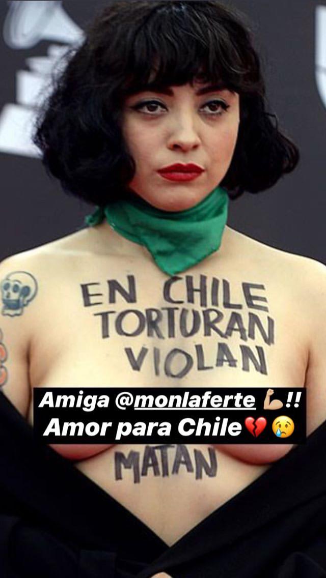 Durante su participación en la alfombra roja del evento, la chilena radicada en México destapó la parte de arriba de su cuerpo y apareció a pecho descubierto junto al mensaje “En Chile torturan, violan y matan” para denunciar los casos de abusos y violaciones a los derechos humanos.