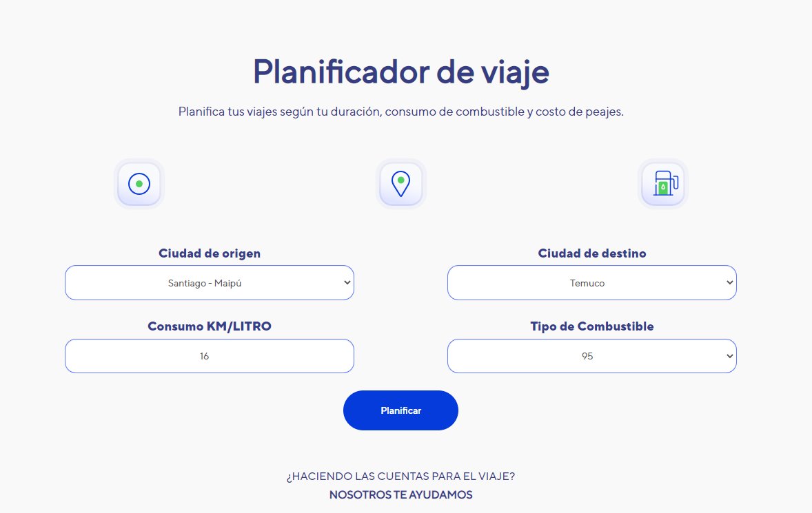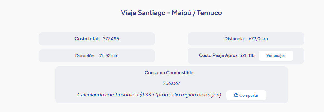 Por ejemplo, si haces un viaje desde Maipú hasta la ciudad de Temuco, Chiletur calcula un costo total de $77.485: $21.418 en peajes (solo ida), mientras que el costo en combustible es de $56.067. Chiletur