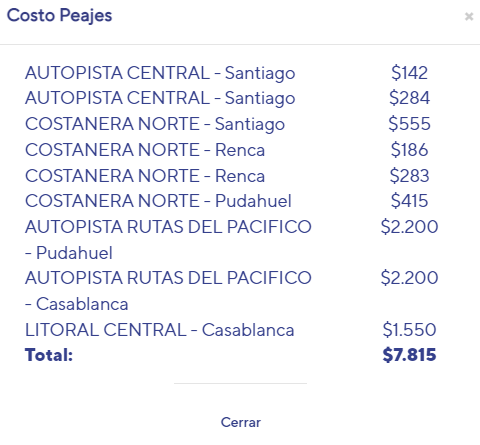 Además, se entrega el detalle del valor de cada uno de los peajes:
