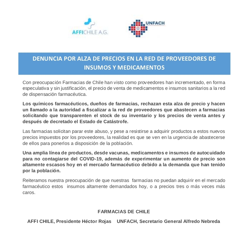 A través de un comunicado, la Asociación Gremial de Químicos Farmacéuticos y Dueños de Farmacias Independientes (AFFI Chile A.G.), y la Unión de Dueños de Farmacias de Chile (Unfach), indicaron que “rechazan esta alza de precio y hacen un llamado a la autoridad a fiscalizar a la red de proveedores que abastecen a farmacias