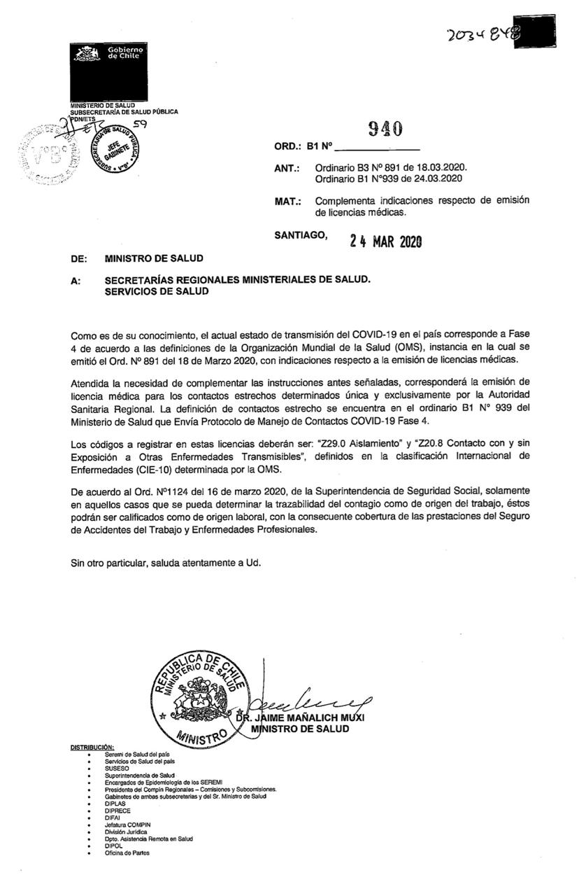 A través de una circular, el Ministerio de Salud instruyó a sus seremis regionales a liberar las licencias médicas para personas que hayan tenido “contacto estrecho” con personas que hayan sido diagnosticadas con COVID-19.