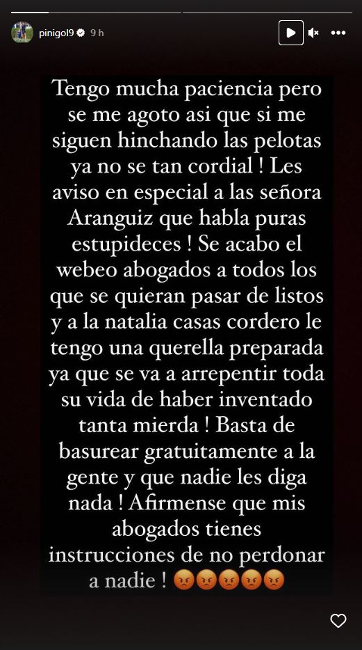 "Tengo mucha paciencia, pero se me agotó. Así que si me siguen hinchando las pelotas ya no seré tan cordial. Les aviso en especial a la señora Aránguiz, que habla puras estupideces. Se acabó el web...", comenzó en la historia de su cuenta personal.