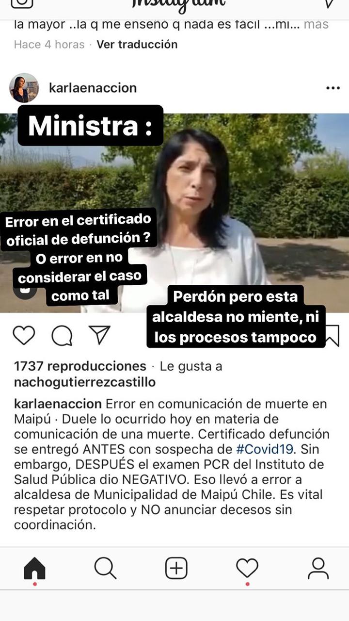 "¿Error en el certificado oficial de defunción o error en no considerar el caso como tal? Perdón, pero esta alcaldesa no miente y los procesos tampoco", escribió Barriga en stories de Instagram.