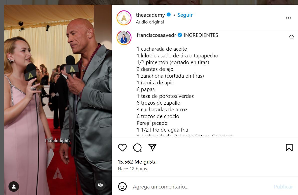 La ceremonia 96° de los premios Oscar 2024 tuvo repercusiones para Chile. Esto luego de que las películas chilenas La Memoria Infinita y El Conde perdieran ante sus contendores en las categorías correspondientes. Lo que desató las bromas en redes sociales. Tal como mencionamos, las y los chilenos se volcaron a la cuenta de la Academia en Instagram, comentando todos los posts del evento realizado la noche del domingo. En estos mensajes, la mayoría decidió dejar reconocidas recetas gastronómicas de nuestro país. Lo que más llamó la atención fue que Francisco Saavedra, reciente animador del Festival de Viña 2024, se quiso sumar a la fiebre chilena y escribió su propia receta en una publicación donde aparece Dwayne Johnson, más conocido como "La Roca". Como se puede apreciar en la siguiente imagen, Saavedra enseñó cómo preparar una rica carbonada. Una acción que causó carcajadas entre las y los compatriotas, aplaudiéndolo por no restarse de este pseudo reclamo por perder la preciada estatuilla dorada.