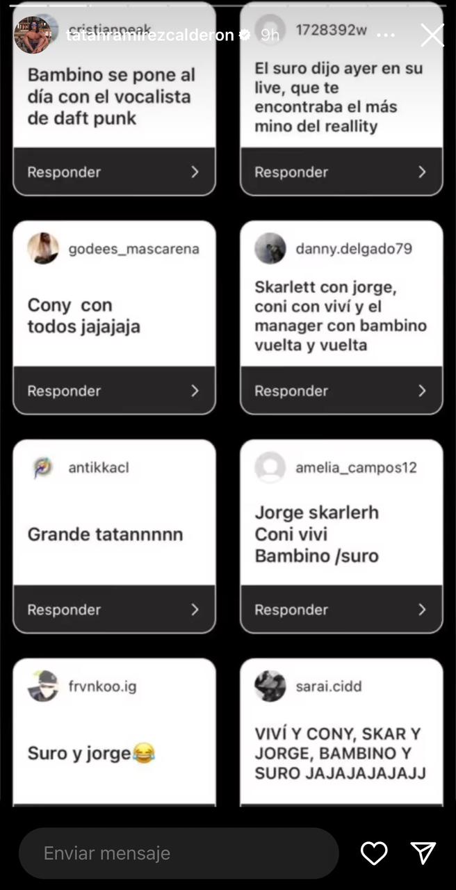 “Son seis. Cinco amigos, compañeros de reality, y hay un mánager por ahí. No sé, le quiero preguntar a la gente que saque sus propias conclusiones", expresó Ramírez. “Y hay tres piezas. ¿Cuáles serían las parejas? ¿Qué dicen ustedes?”, agregó mientras esbozaba una picara sonrisa. Sin embargo, las teorías conspirativas no se hicieron esperar por parte de los cibernautas, quienes hicieron sus apuestas a particulares romances que podrían surgir en las vacaciones de los ex Gran Hermano. Finalmente, en las respuestas algunos propusieron "Suro y Jorge", "Skarleth con Jorge, Coni con Vivi y el manager con Bambino", "Bambino y Suro".