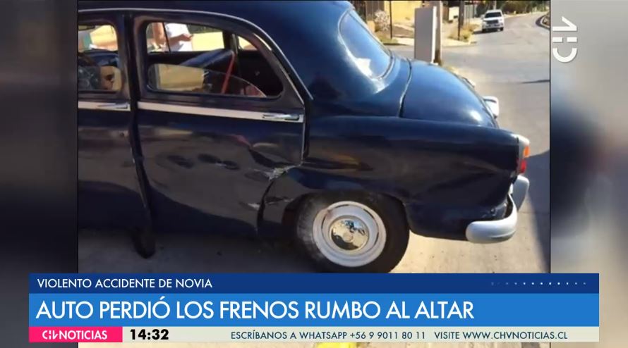 Momentos de terror fueron los que vivió una novia junto a su padre, luego que el automóvil clásico en el que viajaban perdiera repentinamente los frenos, terminando todo en un accidente de tránsito y no en la Iglesia.