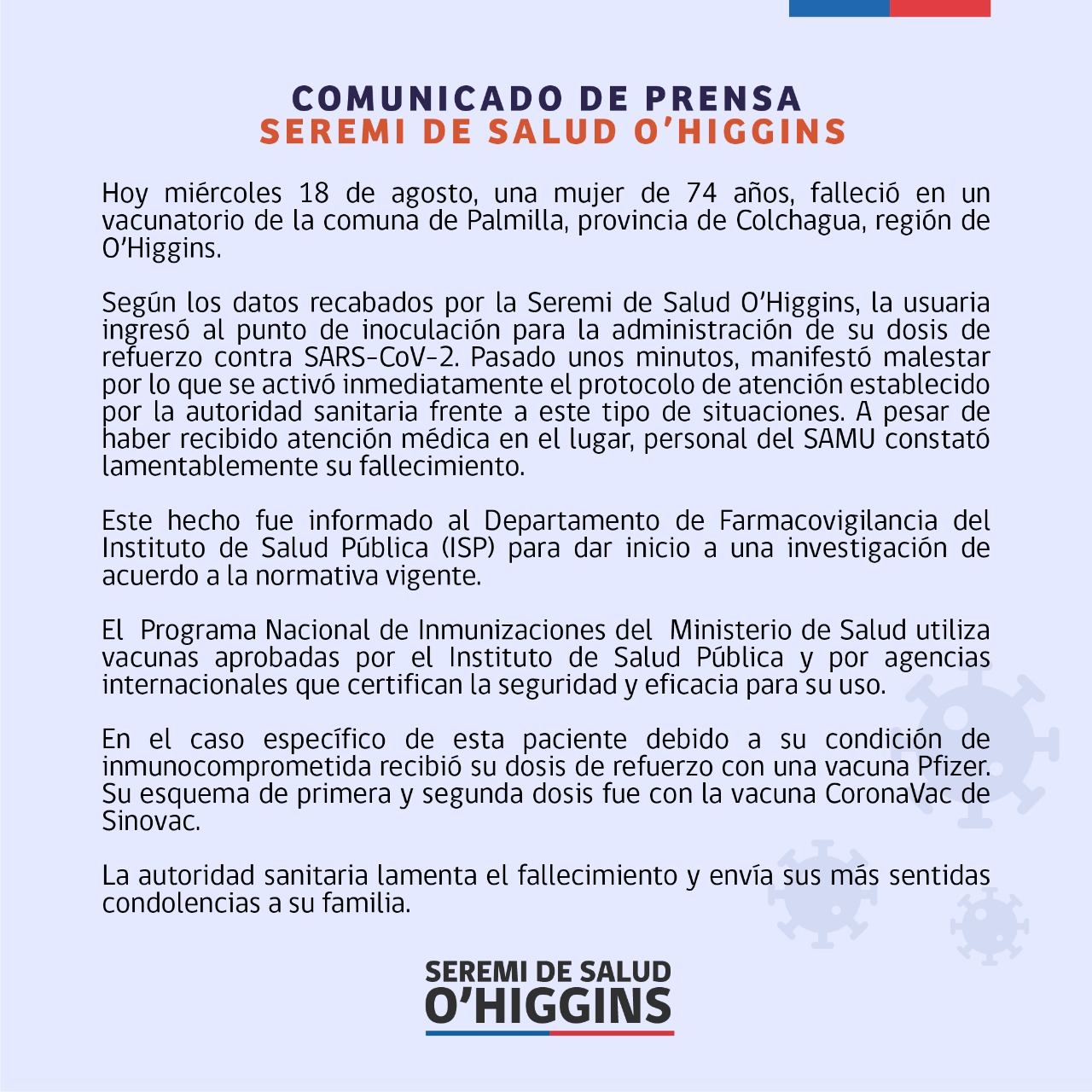 Asimismo, desde la Seremi de Salud de O'Higgins emitieron un comunicado para sumar antecedentes respecto al caso. En primer lugar, informaron que efectivamente la adulta mayor acudió al punto de inoculación para recibir su dosis de refuerzo contra el COVID-19.