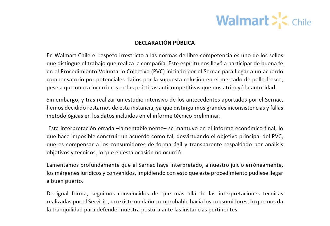 A través de un comunicado, la empresa aseguró que participaron "de buena fe" en el Procedimiento Voluntario Colectivo iniciado por el Sernac, ante lo que ellos definen como "la supuesta colusión en el mercado de pollo fresco" e insistieron en que "nunca incurrimos en las prácticas anti competitivas que nos atribuyó la autoridad”.
