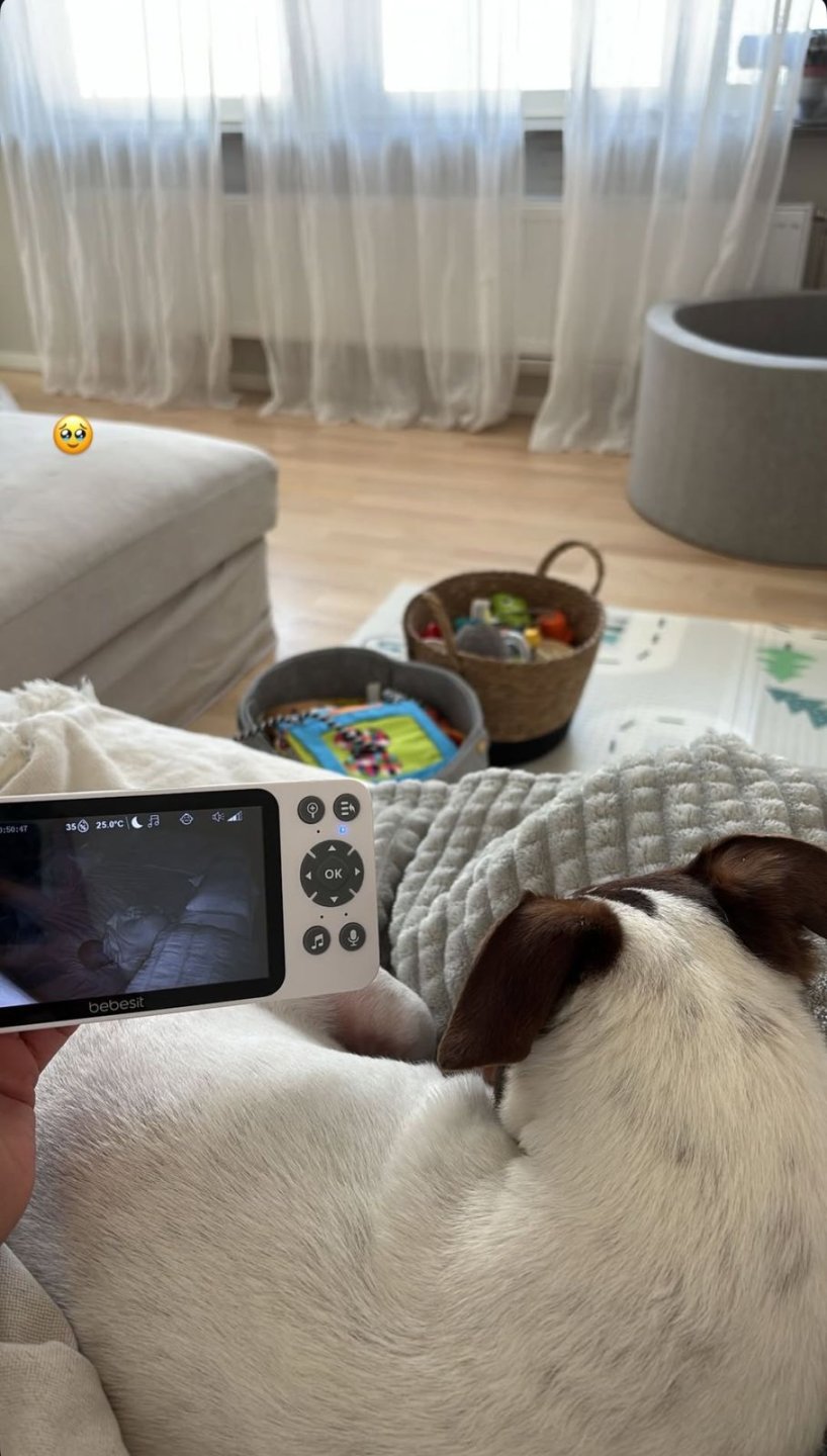 Finalmente, Méndez acompañó el anuncio con una fotografía desde la sala de estar de su casa, acompañada de su perrito Otto, mientras ambos ven el monitor donde aparece Gio durmiendo.