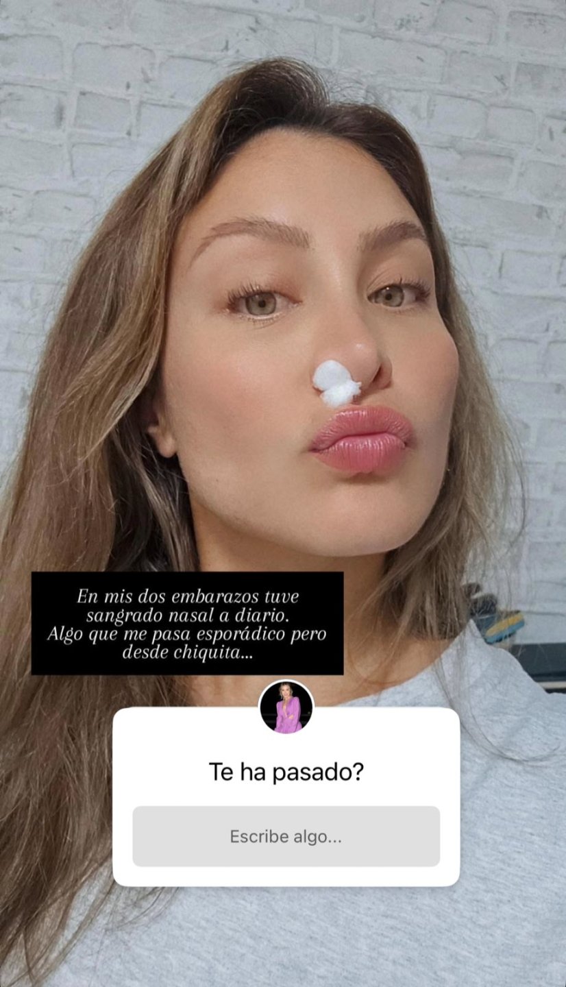 "En mis dos embarazos tuve sangrado nasal a diario", confesó Sabrina, quien publicó una fotografía donde aparece intentando contener el sangrado con un trozo de algodón.