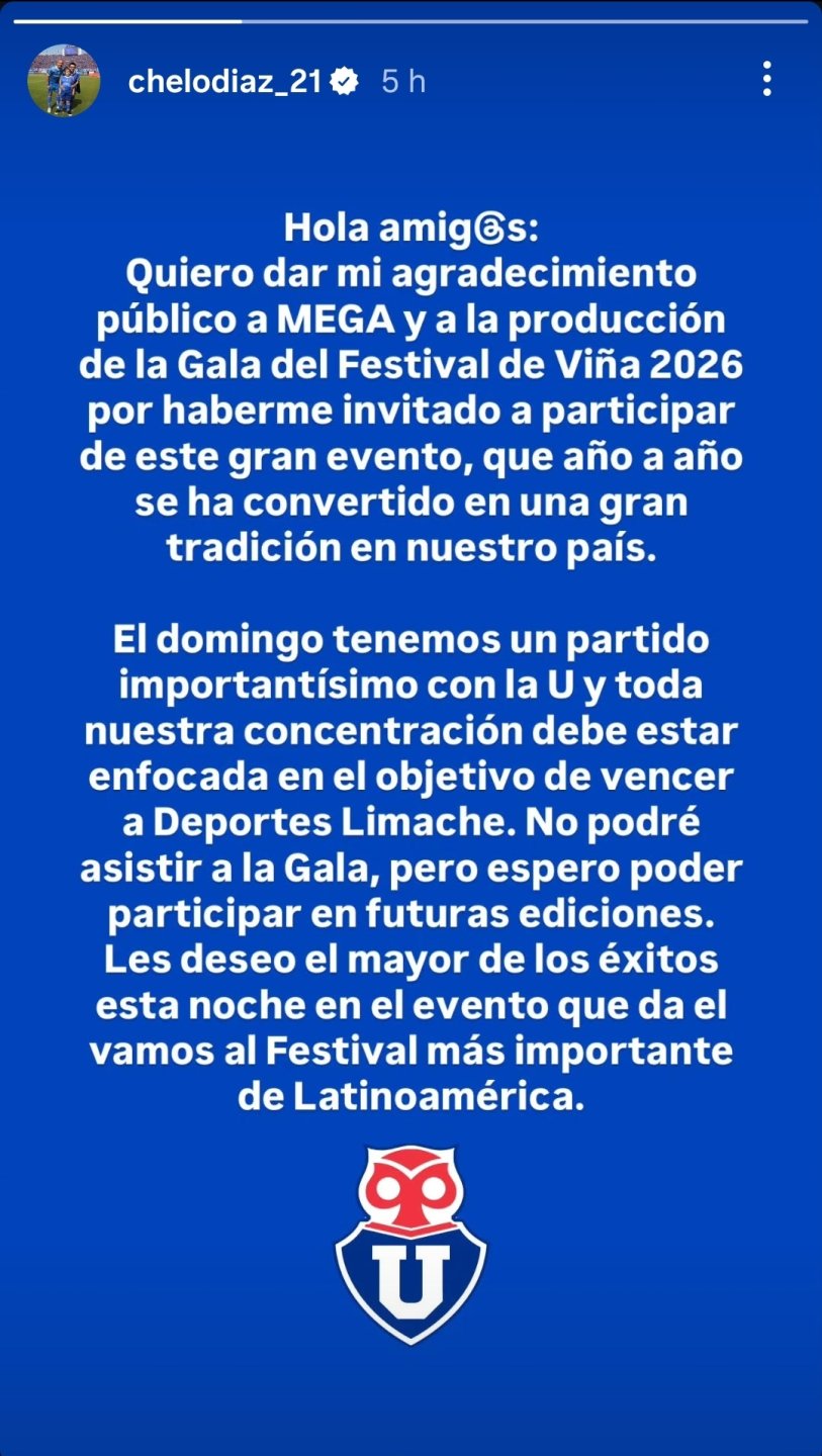 “Quiero dar mi agradecimiento público al canal y la producción de la gala del Festival de Viña 2026 por haberme invitados participar de este gran evento, que año a año se ha convertido en una gran tradición en nuestro país”, escribió en una historia de Instagram.