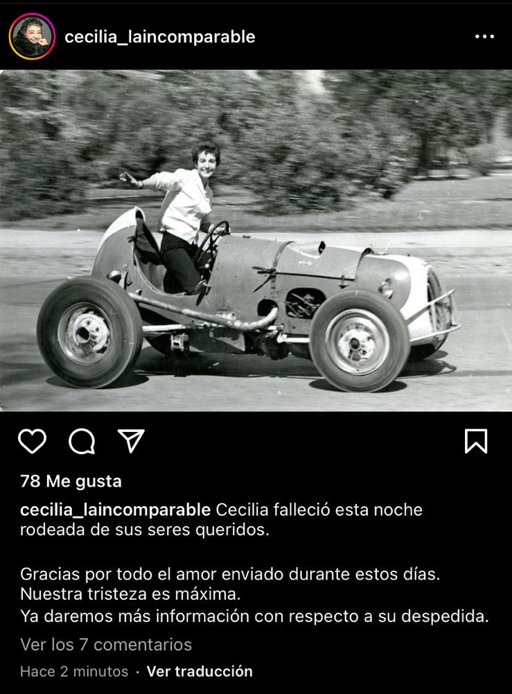 "Cecilia falleció esta noche rodeada de sus seres queridos. Gracias por todo el amor enviado durante estos días. Nuestra tristeza es máxima", señalaron desde el entorno de la artista confirmando su deceso.