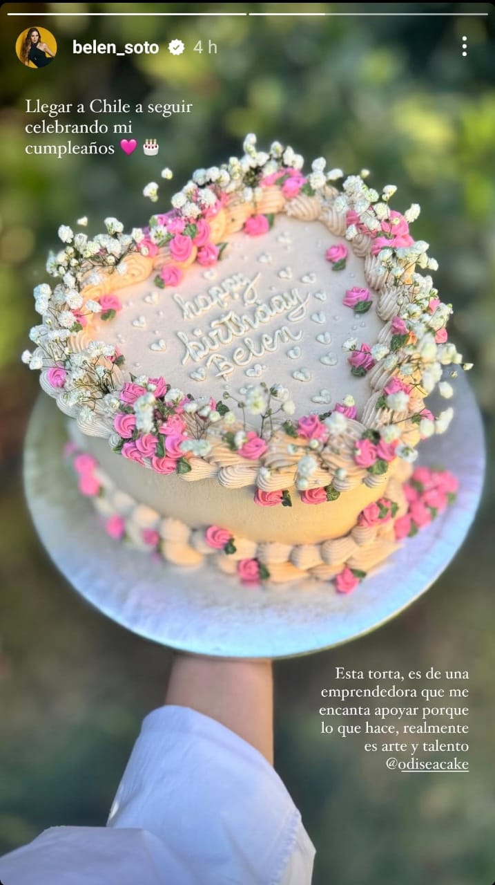 "Llegar a Chile a seguir celebrando mi cumpleaños", escribió en una publicación Belén Soto, esto acompañado de una torta que ocupará en la celebración.
