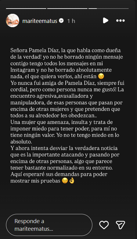 "Señora Pamela Díaz ¡La que habla como dueña de la verdad! Yo no he borrado ningún mensaje contigo, tengo todos los mensajes en mi Instagram y no he borrado absolutamente nada, el que quiera verlos, ahí están", comenzó diciendo Marité en su cuenta de Instagram.