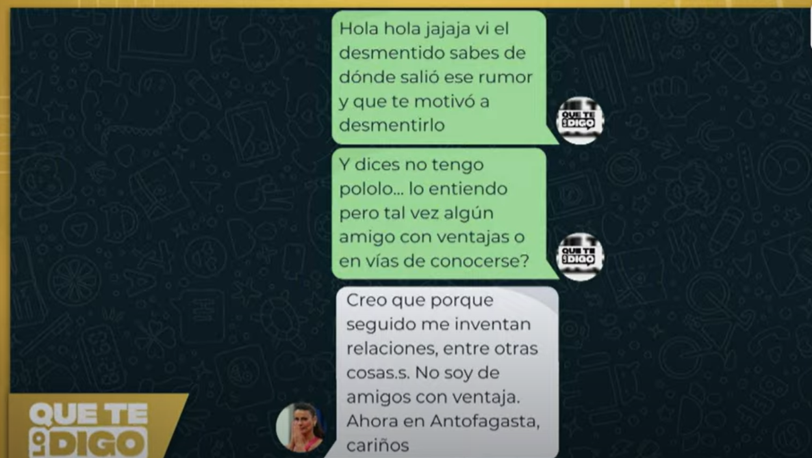 Así lo reveló el programa Que te lo digo, donde se habrían comunicado con la ex Miss Chile a través de WhatsApp para preguntarle su opinión acerca de los rumores.
