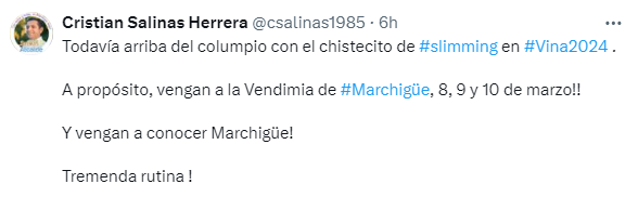 A través de su cuenta en X, Salinas se tomó con humor su aparición en la rutina, afirmando que "todavía (estoy) arriba del columpio con el chistecito de Slimming en Viña 2024". "A propósito, vengan a la Vendimia de Marchigüe, 8, 9 y 10 de marzo!!", comentó la autoridad municipal, instando al público a conocer esta ciudad ubicada en la Región de O'Higgins. Al cierre de su tuit, simplemente tuvo halagos para el comediante: "Tremenda rutina".