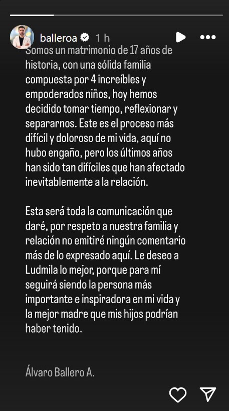 Junto con eso, Ballero expresó que "esta será toda la comunicación que daré, por respeto a nuestra familia y relación no emitiré ningún comentario más de lo expresado aquí".