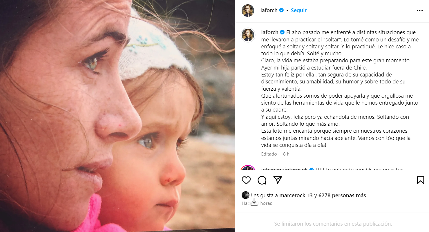 La tarde de este viernes, la cantante chilena Amaya Forch compartió en sus redes sociales un emotivo mensaje en honor a su hija, Julieta Gómez-Pablos Forch, quien se fue del país para estudiar en el extranjero.
