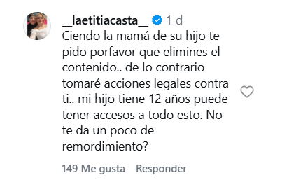 Sobre la misma, añadió: “Mi hijo tiene 12 años, puede tener acceso a todo esto, ¿no te da un poco de remordimiento?“.