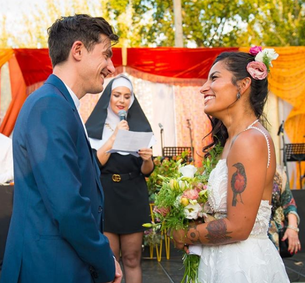 Al aire libre, con una decoración acogedora y vestuarios sencillos de los protagonistas se realizó el evento, que tuvo una particular sorpresa: la encargada de oficiar la misa fue la comediante Natalia Valdebenito, quien apareción vestida de monja con un cinturón Gucci, y se subió al escenario.