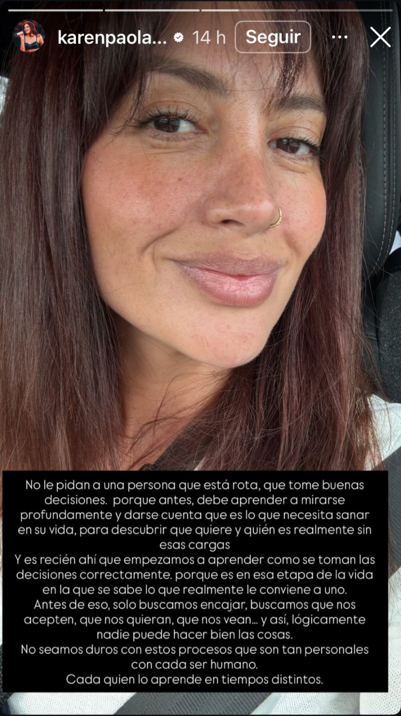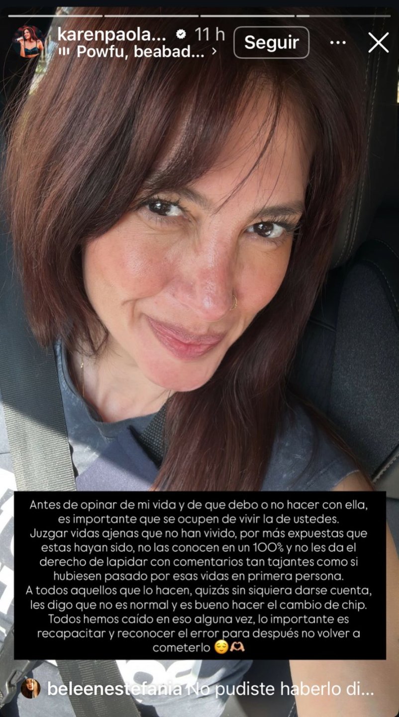"Antes de opinar de mi vida y de qué debo o no hacer con ella, es importante que se ocupen de vivir la de ustedes. Juzgar vidas ajenas que no han vivido, por más expuestas que estas hayan sido, no las conocen en un 100% y no les da el derecho de lapidar con comentarios tan tajantes como si hubiesen pasado por esas vidas en primera persona", escribió Karen.