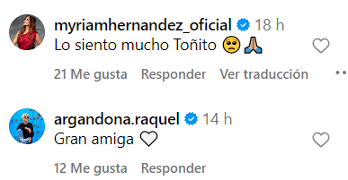 "Lo siento mucho, Toñito", escribió Myriam Hernández, quien es una amiga cercana de quien fue el animador del Festival de Viña. Así también lo hizo Raquel Argandoña, escribiendo: "Gran amiga", junto a un corazón.