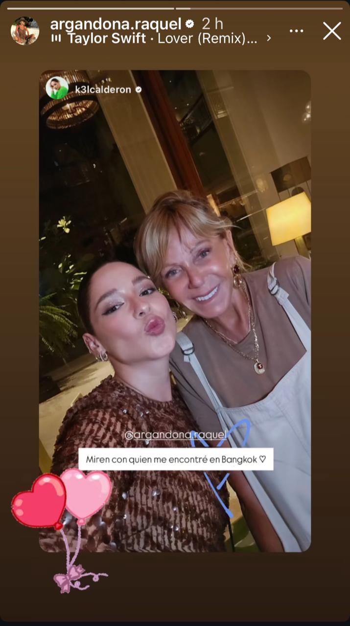 Al respecto, Calderón publicó una selfie de ambas con un corazón y señaló: "Miren con quién me encontré en Bangkok", etiquetando la cuenta de su madre.