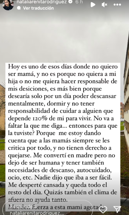 es más bien porque desearía sólo por un día poder descansar mentalmente, dormir y no tener responsabilidad de cuidar a alguien que depende 120% de mí para vivir", señaló la influencer en sus historias de Instagram.