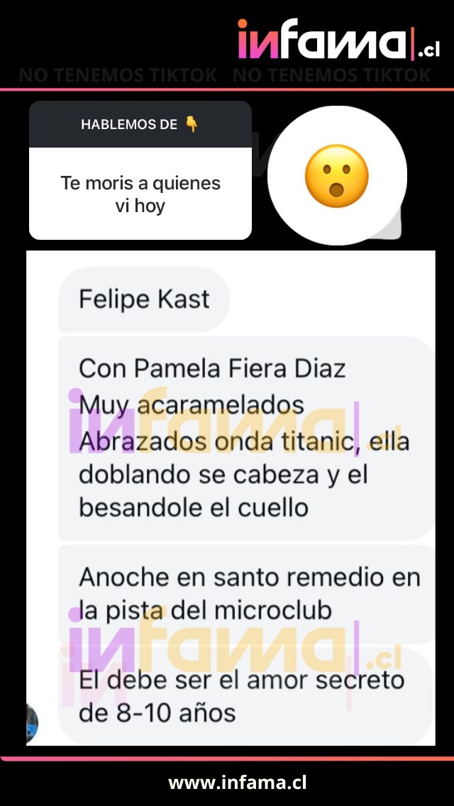 "Felipe Kast con Pamela 'Fiera' Díaz, muy acaramelados, abrazados onda 'Titanic', ella doblando su cabeza y él besándole el cuello", aseguraron.