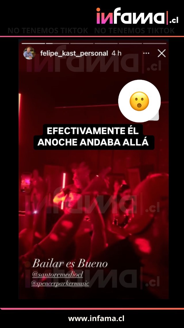 Por otra parte, también revelaron una captura de pantalla desde la cuenta personal de Felipe Kast, en donde se le ve en dicha fiesta y aseguró: "Bailar es bueno".