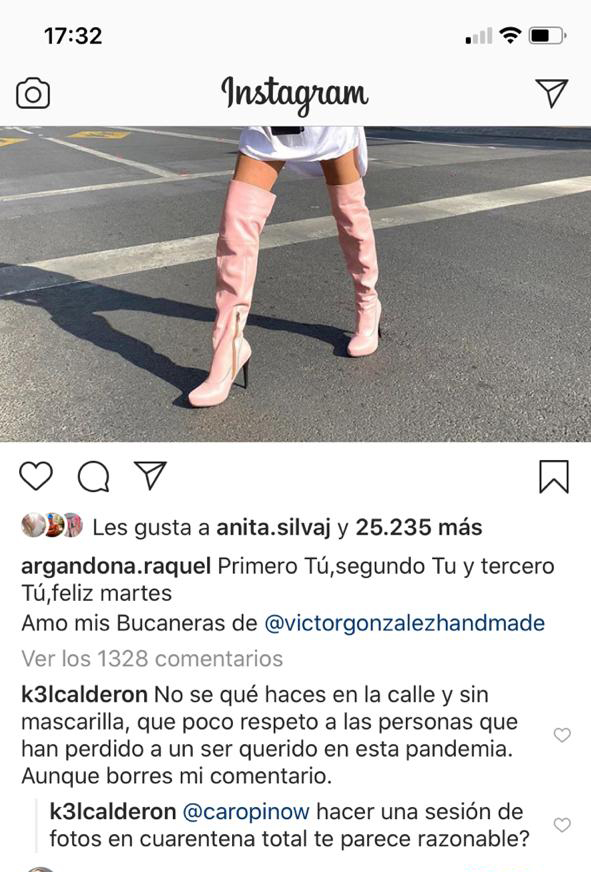 Ante esto, Kel escribió en la sección de comentarios de Instagram bajo la foto "no sé que haces en la calle y sin mascarilla, qué poco respeto a las personas que han perdido un ser querido en esta pandemia. Aunque borres mi comentario".