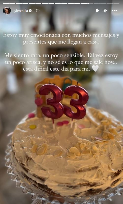 Estoy muy emocionada con muchos mensajes y presentes que me llegan a casa", comenzó diciendo en una historia donde se puede ver una torta junto a velas que marcan el 33.