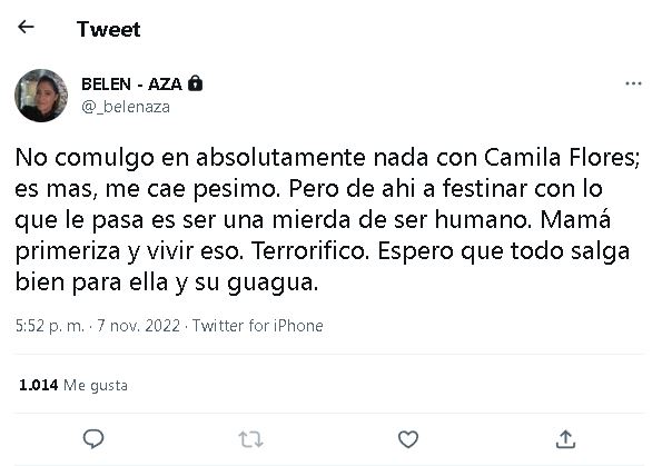 "No comulgo en absolutamente nada con Camila Flores; es más, me cae pésimo. Pero de ahí a festinar con lo que le pasa es ser una mierda de ser humano", escribió en su cuenta de Twitter.