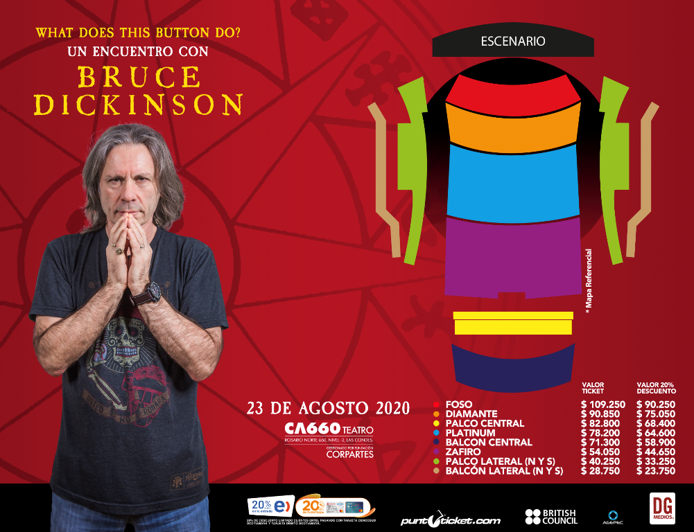 Tras una multitudinaria presentación en el Estadio Nacional en octubre, el vocalista de Iron Maiden vuelve al país con un show conversatorio para el 23 de agosto en Teatro Corpartes. El motivo de este evento será la presentación de su autobiografía What does this button do?, reconocido como un Best-Seller por The New York Times, donde el cantante repasa su vida personal, musical y otros proyectos ajenos a las artes.