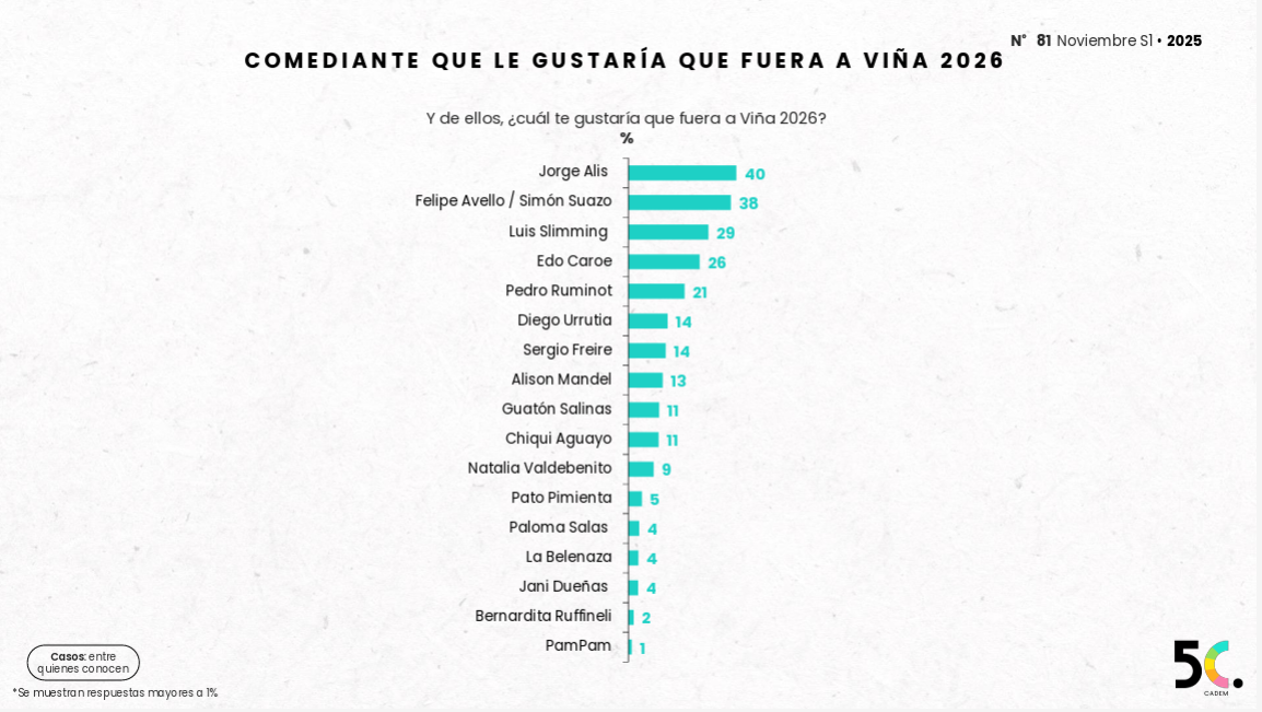 A través de diferentes preguntas, el sondeo mostró cuál es el comediante favorito de este género y a quiénes les gustaría ver en el Festival de Viña del Mar 2026.