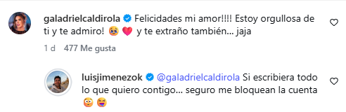 “Felicidades, mi amor. Estoy orgullosa de ti y te admiro. Y te extraño también… jaja“, le escribió Gala al Mago en una fotografía, la que tuvo una rápida respuesta por parte del enamorado.