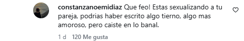 Mientras tanto, otras seguidora comentó molesta: “¡Qué feo! Estas sexualizando a tu pareja, podrías haber escrito algo tierno, algo más amoroso, pero caíste en lo banal“.