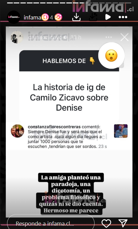 "La amiga planteó una paradoja, una dicotomía, un problema filosófico y quizás ni se dio cuenta. Hermoso me parece", escribió Camilo junto al comentario sobre Denise Rosenthal.